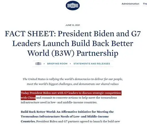 Bidenova inicijativa "Izgradimo bolji svijet", koju je podržao G7, prodavana je kao nešto što će konkurirati Kini i zadovoljiti "ogromne infrastrukturne potrebe zemalja sa niskim i srednjim prihodima... Izgradimo bolji svijet (B3W) je transparentno infrastrukturno partnerstvo koje vode velike demokracije, kako bi se smanjile potrebe za infrastrukturom od 40 bilijuna dolara u zemljama u razvoju..."