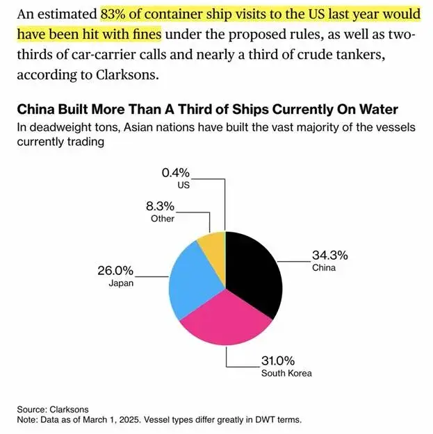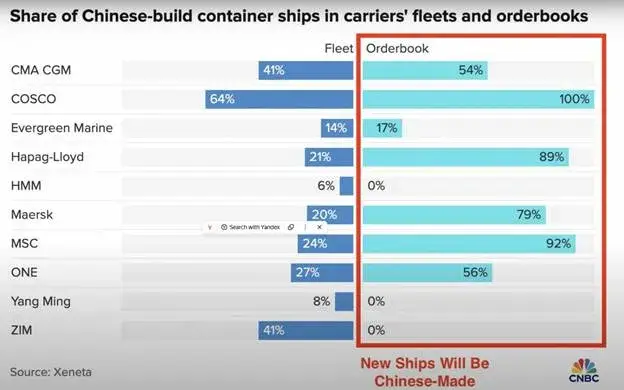 Ovo je izuzetno destruktivno. Te su tvrtke već uložile mnogo u kupovinu brodova i sada će biti kažnjene za svaki pokušaj proširenja svoje trgovine, jer neće imati drugog izbora nego kupiti kineske kontejnerske brodove, jer ih NITKO DRUGI NE PROIZVODI u količini potrebnoj za olakšavanje svjetske trgovine!!! SAD planiraju visoko oporezovati sve ove tvrtke zbog zločina korištenja kineskog kontejnerskog broda, dok SAD ne proizvode dovoljno brodova niti za olakšavanje vlastite trgovine. To će se ozbiljno obiti o glavu trgovini sa SAD-om, a ne sa svijetom.
