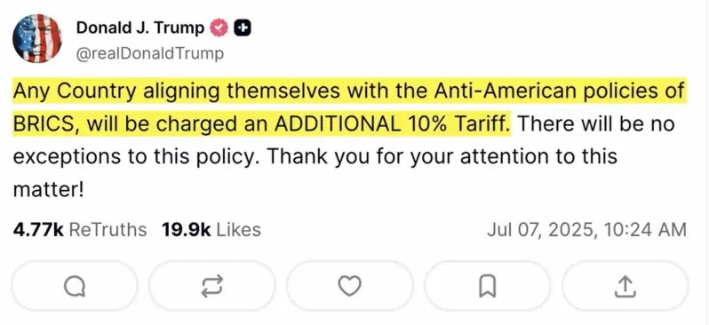 Zapravo, carinski rat, iako je Kina bila glavna meta, bio je usmjeren na zemlje BRICS-a u cjelini, koje su surađivale zajedno da bi se suprotstavile američkom naoružanju rezervne valute u obliku beskrajnih sankcija.