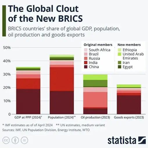 BRICS je stoga savez zemalja koje su se formirale zato da bi se suprotstavile prevelikoj dominaciji G7 u svjetskoj politici, kao i gospodarskom razvoju, te se "zalagale za samoodređenje globalnog Juga".