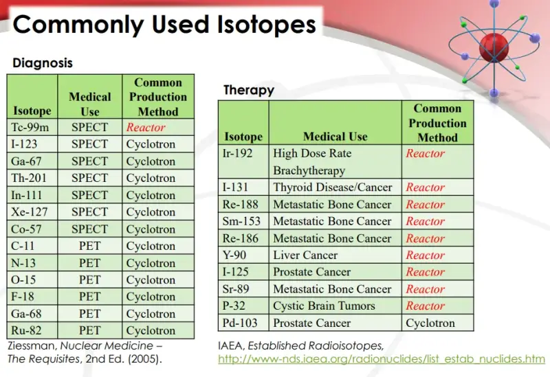 Dok ciklotroni (poput iranskih Pars ili Karaj ciklotrona) mogu generirati neke izotope koji se koriste u medicini (potrebne za PET i MRI dijagnostiku), mnogi se mogu stvoriti samo pomoću reaktora koji koriste visoko obogaćeni uran, kao što je prikazano na gornjem grafikonu.