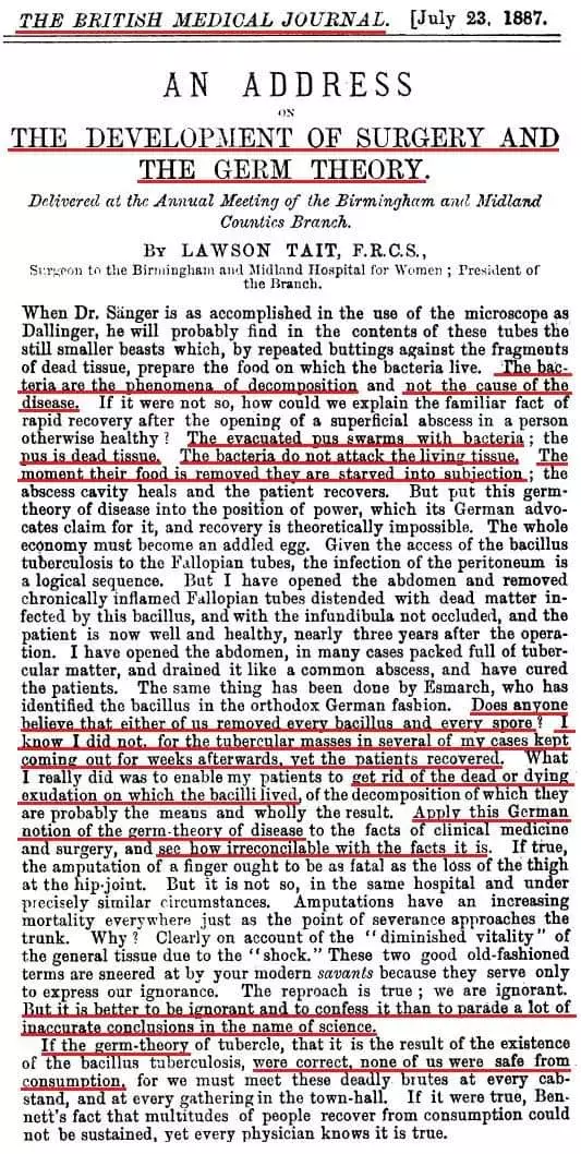 Daniel Roytas s Humanley.com otkrio je članak koji je napisao dr. Lawson Tait, glavni kirurg bolnice u Birminghamu i Midlandsu, objavljen u British Medical Journalu 1887. godine, gdje je uloga bakterija jasno definirana kao fenomen razgradnje, a ne bolesti. Bakterije ne napadaju živo tkivo, a nakon što se otpadni materijal ukloni, bakterije se "izgladnjuju da se pokore". Dr. Tait je izjavio kako je “najbolji od svih dokaza zablude” tvrdnji njemačkih istraživača o klicama kao uzročnicima bolesti “činjenica kako je svaki pokušaj uzdizanja činjenica o klicama truljenja u teoriju o klicama bolesti imao jadan uspjeh. Nije uspjelo, i nigdje nije uspjelo tako upadljivo kao kad se umetnulo u područje liječenja bolesti.” Govorio je o vlastitom iskustvu kako nije mogao eliminirati sve bakterije kod tuberkuloznih pacijenata, a ipak su se pacijenti ipak oporavili kada im je omogućio neka svoja tijela oslobode otpadnih tvari od kojih su bakterije živjele. Dr. Tait je istaknuo kako je teorija o klicama nespojiva s činjenicama i da, kada bi bila točna, nitko ne bi bio siguran, jer bi se bacili tuberkuloze nalazili posvuda.