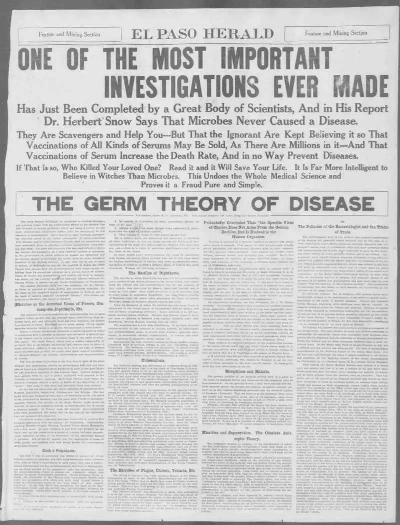 U duhu slušanja i učenja iz prošlosti, ovdje predstavljam ono što smatram jednim od najboljih ranih pobijanja teorije o klicama bolesti. Korisnik Twittera po imenu CharliePoet upozorio me na donji članak El Paso Heralda iz 1913. godine, i smatram kako članak treba podijeliti u cijelosti. Usput ću sažeti i ubaciti komentare, dok ću pružati relevantne informacije za koje smatram kako se u potpunosti poklapaju s iznesenim argumentom. U naslovu je stajalo kako je ovo "jedna od najvažnijih istraga ikada provedenih", i ja se svim srcem slažem s tim. Neka padne kula od karata teorije klica.