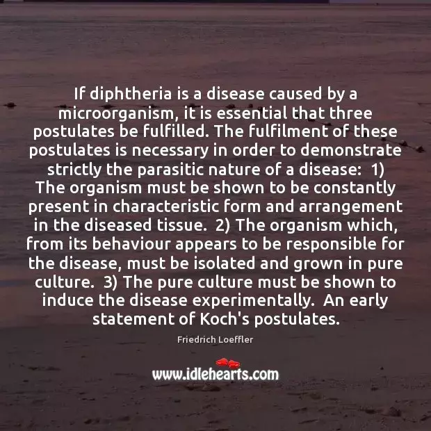 Gledajući dokaze za difteriju, dr. Snow je spomenuo da, tijekom istraživanja gospode, Klebsa i Loefflera, nisu mogli pronaći povezanu bakteriju u 35% (1 od 4) slučajeva bolesti. Očito, to znači da se dokaz o mikrobu kao uzročniku odmah sukobljava s prvim Kochovim postulatom koji zahtijeva da mikrob bude prisutan u svim slučajevima bolesti. Čak je i Sir William Osler, koji se smatra jednim od najistaknutijih vođa u modernoj medicini, priznao kako bakterija redovito nema u slučajevima bolesti. Također su mnogi neovisni istraživači otkrili da ga ima u izobilju kod potpuno zdravih ljudi. Prisutan je kod mnogih drugih bolesti kao što su slučajevi tuberkuloze, u vezikulama cjepiva, u sluzi od obične upale grla, kod stomatitisa, rinitisa, konjuktivitisa, kod ekcema i drugih kožnih erupcija, te kod gangrene, nome, ozoene. Pronalaženje u nepovezanim bolestima još je jedan način na koji bakterija ne ispunjava prvi Kochov postulat. Kada je ubrizgan u životinje, ista bolest kao što je viđena kod ljudi nije bila proizvedena, čime je iznevjeren treći Kochov postulat. Drugim riječima, bacil difterije ne zadovoljava Kochove postulate pružajući potrebne dokaze koji dokazuju da je on uzročnik bolesti. Ironično, Loeffler je izjavio, tijekom proslave Kochova 60. rođendana 1903. godine, da je razvoj "Kochovih postulata" bio odlučujući uspjeh za znanstveno dokazivanje kako mikrob uzrokuje bolest, nešto što je jasno da on sam nije mogao postići.