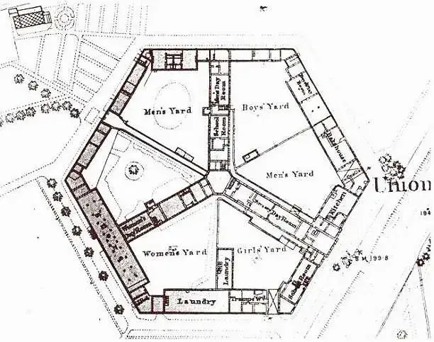 Jedan od tih kontrasta bio je usredotočen na "kuće za siromašne". Ondašnji 'moderni' će biti poznati čitateljima Dickensa, ili čitateljima Foucaulta, u ovom slučaju. To je radna kuća, od one vrste koju je naručila britanska država, nakon novog zakona o siromašnima iz 1834. godine. U ovoj strukturi, nalik zatvoru, od siromašnih se očekivalo da rade i podnose ovakve teške uvjete, u zamjenu za svoje preživljavanje. Osmerokutni raspored omogućuje malom broju nadglednika, koji su smješteni u središnjem osmatračničkom tornju, neka bdiju nad zatvorenicima. Pugin je svoj crtež temeljio na planu Sampsona Kempthornea, koji je pak bio inspiriran poznatim dizajnom Panoptikuma, utilitarističkog filozofa Jeremyja Benthama. Politika korištenja radnih domova za ublažavanje siromaštva je bila opravdana i prema utilitarističkim terminima. Smatralo se kako je ovo rješenje u interesu stanovništva u cjelini, jer je odvraćalo siromašne od traženja milosrđa, čime su se štedjela javna sredstva i poticalo veće samopouzdanje, navodno, među siromašnima.