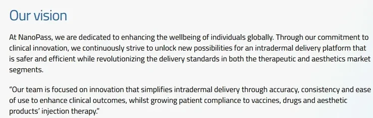 "NanoPassova jedinstvena dubinska tehnologija revolucionirala je medicinsku isporuku, uključujući cjepiva, liječenje lijekovima i estetiku. Predviđamo da će tehnologija NanoPass poremetiti tržište i postati primarna metoda za davanje cjepiva, tretmana pomlađivanja kože i drugih lijekova, koji zahtijevaju preciznu isporuku na kožu", rekao je osnivač i izvršni partner Awza Yaron Ashkenazi. "Awz zamišlja tehnologiju NanoPass kao ključnu komponentu u poboljšanju javnog zdravlja i otpornosti, te ključno rješenje za pandemije."