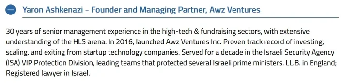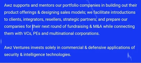 Awz je globalna, višestupanjska investicijska tvrtka, koja je usmjerena na višenamjenske, komercijalne primjene inovativnih tehnologija temeljenih na umjetnoj inteligenciji, duboke tehnologije, fintecha, kibernetičke sigurnosti, medtech i obavještajnih tehnologija—s uredima u Kanadi, Izraelu i SAD-u. Awz do danas upravlja s više od 500 milijuna američkih dolara, u pet fondova s više od 35 izvanrednih kompanija u portfelju, te dosljedno dokazuje svoju sposobnost pružanja iznimnih povrata svojim LP-ovima. Predvođeni osnivačem i upravnim partnerom, g. Yaronom Ashkenazijem, osnivačem i predsjednikom odbora, g. Edom Sonshineom, i predsjednikom Savjetodavnog odbora, Rt. poštovanim Stephen J. Harperom (22. premijer Kanade); menadžment i savjetnici Awza uključuju: uspješne stručnjake za rizični kapital, stručnjake iz industrije i bivše direktore i više rukovoditelje iz izraelskih i globalnih sigurnosnih i obavještajnih agencija (CIA, FBI, MI5, CSIS, CAF, Mossad, ISA, jedinica 8200).