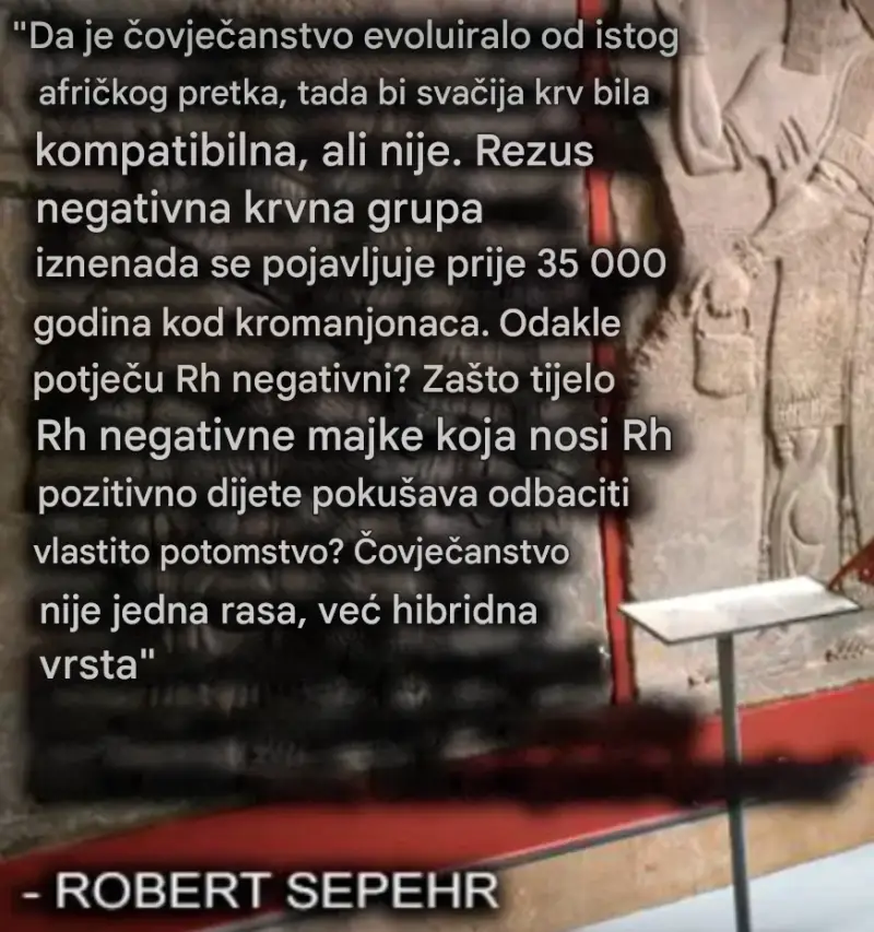 "Ako je Rh negativna krv jednostavno mutacija, zašto onda toliko Rh negativnih ljudi ima i dodatni kralješak? To se također zgodno objašnjava kao "mutacija". Moderno sekvenciranje DNK pokazalo je da čovječanstvo nije jedna "rasa", koja potječe od istog afričkog pretka, već hibridizirana vrsta." (Robert Sepehr)